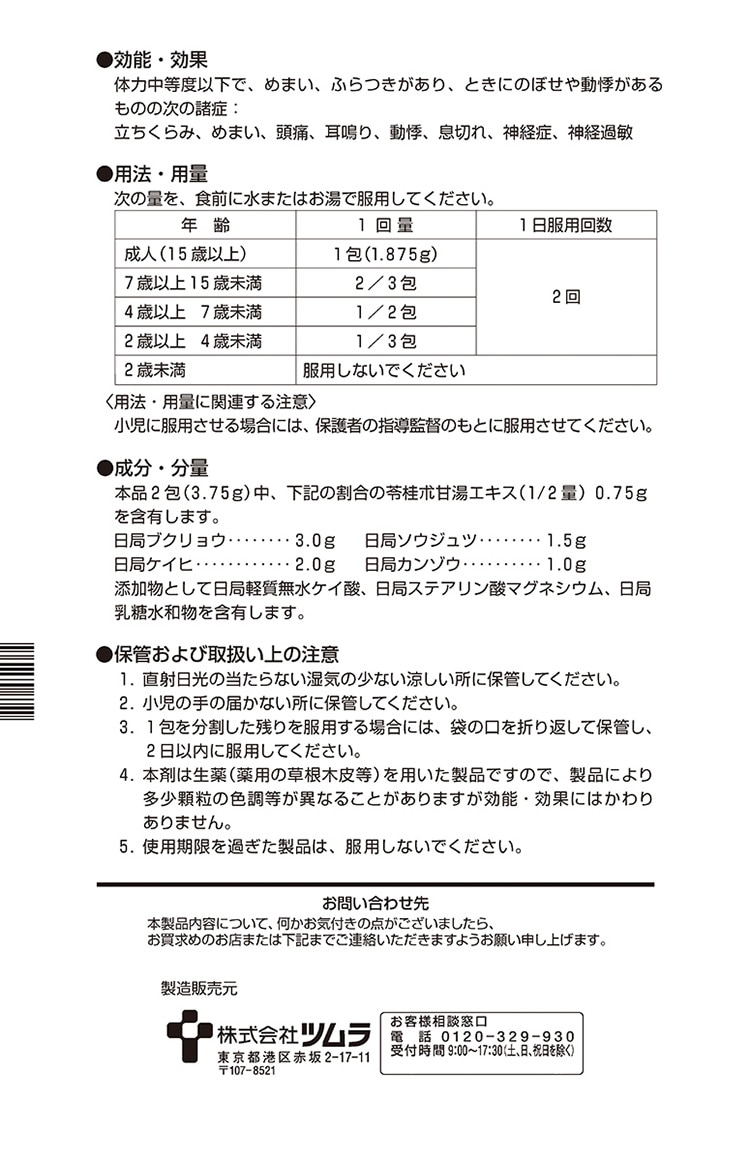 本品2包(3.75g)中、下記の割合の苓桂朮甘湯エキス(1/2量)0.75gを含有します。