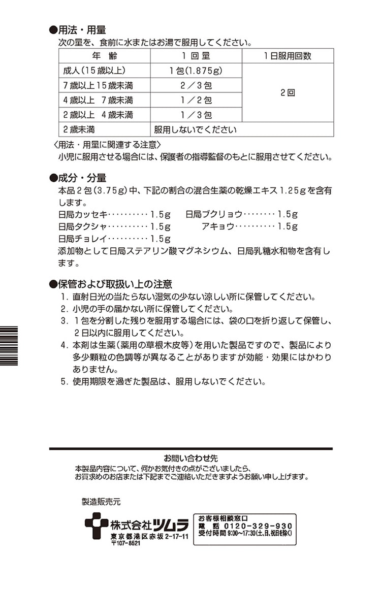 4.本剤は生薬(薬用の草根木皮等)を用いた製品ですので、製品により多少顆粒の色調等が異なることがありますが効能・効果にはかわりありません。