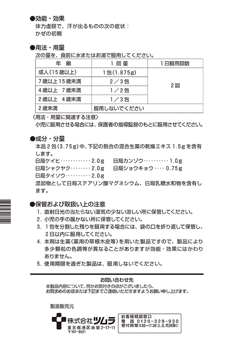 | 本品2包(3.75g)中、下記の割合の混合生薬の乾燥エキス1.5gを含有します。 ・日局ケイヒ・・・2.0g ・日局シャクヤク・・・2.0g ・日局タイソウ・・・2.0g ・日局カンゾウ・・・1.0g ・日局ショウキョウ・・・0.75g 添加物として日局ステアリン酸マグネシウム、日局乳糖水和物を含有します。 |