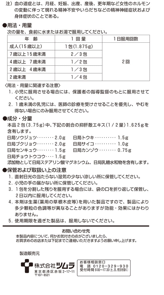| 本品2包(3.75g)中、下記の割合の抑肝散エキス(1/2量)1.625gを含有します。 日局ソウジュツ:2.0g 日局ブクリョウ:2.0g 日局センキュウ:1.5g 日局チョウトウコウ:1.5g 日局トウキ:1.5g 日局サイコ:1.0g 日局カンゾウ:0.75g 添加物として日局ステアリン酸マグネシウム、日局乳糖水和物を含有します。 |