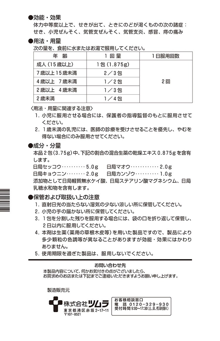 | 本品2包(3.75g)中、下記の割合の混合生薬の乾燥エキス0.875gを含有します。 ・日局セッコウ・・・5.0g ・日局キョウニン・・・2.0g ・日局マオウ・・・2.0g ・日局カンゾウ・・・1.0g 添加物として日局軽質無水ケイ酸、日局ステアリン酸マグネシウム、日局乳糖水和物を含有します。 |