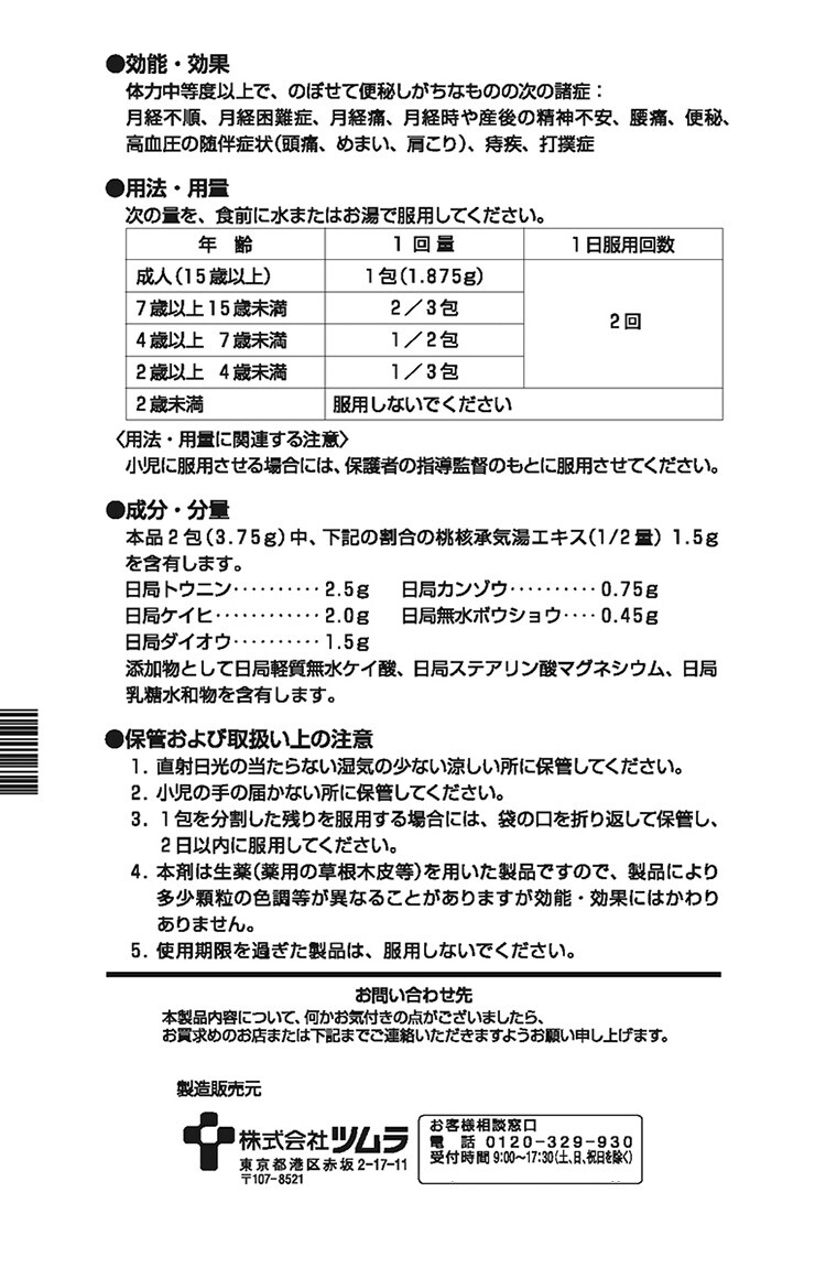 | 本品2包(3.75g)中、下記の割合の桃核承気湯エキス(1/2量)1.5gを含有します。 ・日局トウニン・・・2.5g ・日局ケイヒ・・・2.0g ・日局ダイオウ・・・1.5g ・日局カンゾウ・・・0.75g ・日局無水ボウショウ・・・0.45g 添加物として日局軽質無水ケイ酸、日局ステアリン酸マグネシウム、日局乳糖水和物を含有します。 |