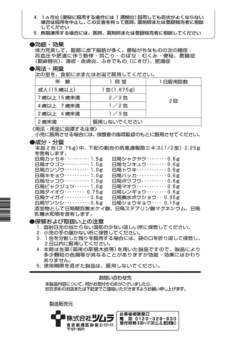 本品2包(3.75g)中、下記の割合の防風通聖散エキス(1/2量)2.25gを含有します。