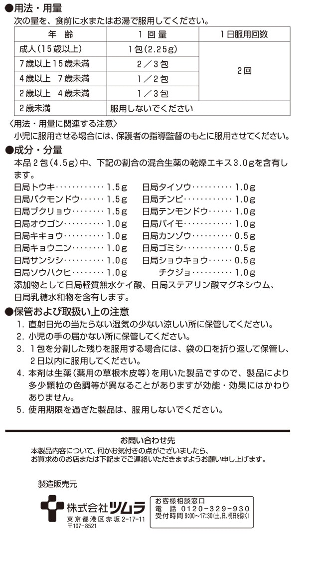 4.本剤は生薬(薬用の草根木皮等)を用いた製品ですので、製品により多少顆粒の色調等が異なることがありますが効能・効果にはかわりありません。