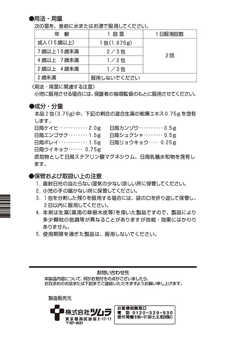 | 本品2包(3.75g)中、下記の割合の混合生薬の乾燥エキス0.75gを含有します。 ・日局ケイヒ・・・2.0g ・日局エンゴサク・・・1.5g ・日局ボレイ・・・1.5g ・日局ウイキョウ・・・0.75g ・日局カンゾウ・・・0.5g ・日局シュクシャ・・・0.5g ・日局リョウキョウ・・・0.25g 添加物として日局ステアリン酸マグネシウム、日局乳糖水和物を含有します。 |