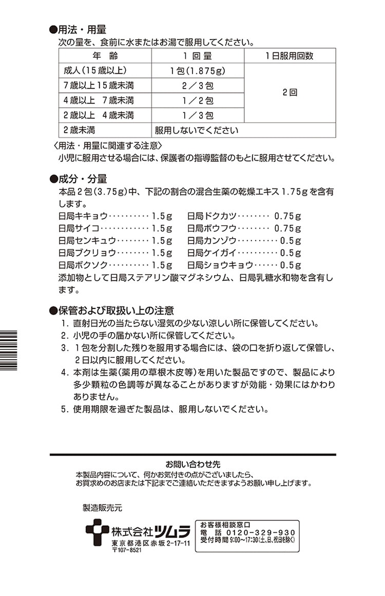 | 本品2包(3.75g)中、下記の割合の混合生薬の乾燥エキス1.75gを含有します。 ・日局キキョウ・・・1.5g ・日局サイコ・・・1.5g ・日局センキュウ・・・1.5g ・日局ブクリョウ・・・1.5g ・日局ボクソク・・・1.5g ・日局ドクカツ・・・0.75g ・日局ボウフウ・・・0.75g ・日局カンゾウ・・・0.5g ・日局ケイガイ・・・0.5g ・日局ショウキョウ・・・0.5g 添加物として日局ステアリン酸マグネシウム、日局乳糖水和物を含有します。 |
