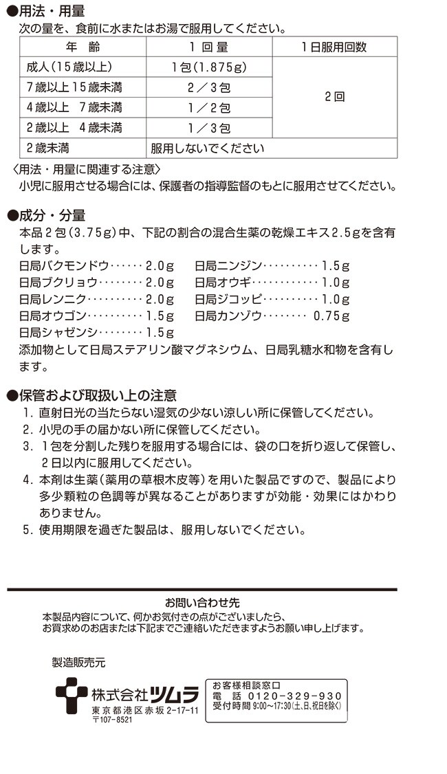 4.本剤は生薬(薬用の草根木皮等)を用いた製品ですので、製品により多少顆粒の色調等が異なることがありますが効能・効果にはかわりありません。