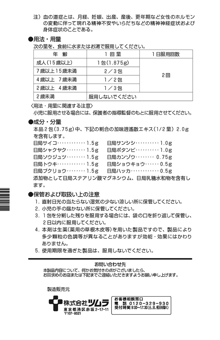 | 本品2包(3.75g)中、下記の割合の加味逍遙散エキス(1/2量)2.0gを含有します。 ・日局サイコ・・・1.5g ・日局シャクヤク・・・1.5g ・日局ソウジュツ・・・1.5g ・日局トウキ・・・1.5g ・日局ブクリョウ・・・1.5g ・日局サンシシ・・・1.0g ・日局ボタンピ・・・1.0g ・日局カンゾウ・・・0.75g ・日局ショウキョウ・・・0.5g ・日局ハッカ・・・0.5g 添加物として日局ステアリン酸マグネシウム、日局乳糖水和物を含有します。 |