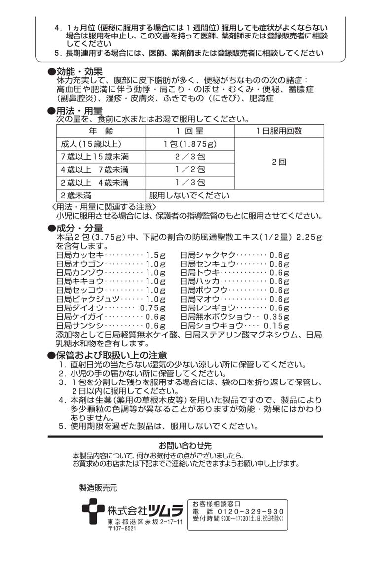 本品2包(3.75g)中、下記の割合の防風通聖散エキス(1/2量)2.25gを含有します。