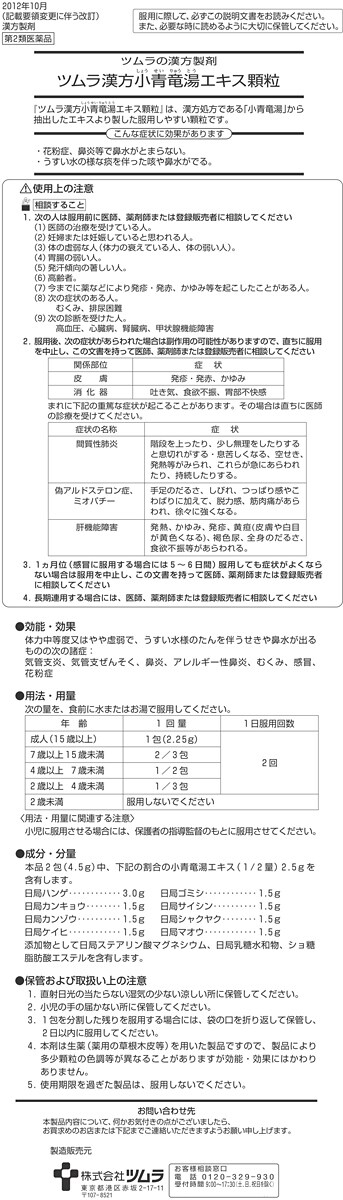 | 本品2包(4.5g)中、下記の割合の小青竜湯エキス(1/2量)2.5gを含有します。 日局ハンゲ:3.0g 日局カンキョウ:1.5g 日局カンゾウ:1.5g 日局ケイヒ:1.5g 日局ゴミシ:1.5g 日局サイシン:1.5g 日局シャクヤク:1.5g 日局マオウ:1.5g 添加物:日局ステアリン酸マグネシウム、日局乳糖水和物、ショ糖脂肪酸エステル |