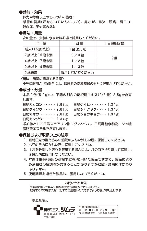 | ・本品2包(5.0g)中、下記の割合の葛根湯エキス(2/3量)2.5gを含有します。 日局カッコン:2.68g 日局タイソウ:2.01g 日局マオウ:2.01g 日局カンゾウ:1.34g 日局ケイヒ:1.34g 日局シャクヤク:1.34g 日局ショウキョウ:1.34g 添加物として日局ステアリン酸マグネシウム、日局乳糖水和物、ショ糖脂肪酸エステルを含有します。 |