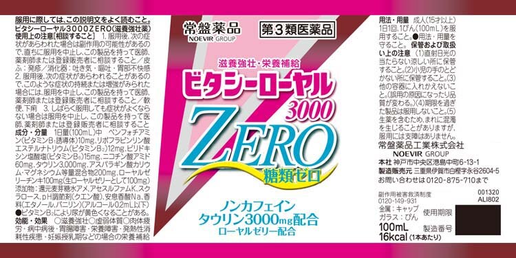 | (1日量(100mL)中) ベンフォチアミン(ビタミンB1誘導体):10mg リボフラビンリン酸エステルナトリウム(ビタミンB2):12mg ピリドキシン塩酸塩(ビタミンB6):15mg ニコチン酸アミド:60mg タウリン:3000mg アスパラギン酸カリウム・マグネシウム等量混合物:200mg ローヤルゼリーチンキ:100mg(生ローヤルゼリーとして100mg) 添加物:還元麦芽糖水アメ、アセスルファムK、スクラロース、pH調整剤(クエン酸)、安息香酸Na、香料(エタノール、バニリン)(アルコール0.2mL以下) ※ビタミンB2により尿が黄色くなることがある。 |