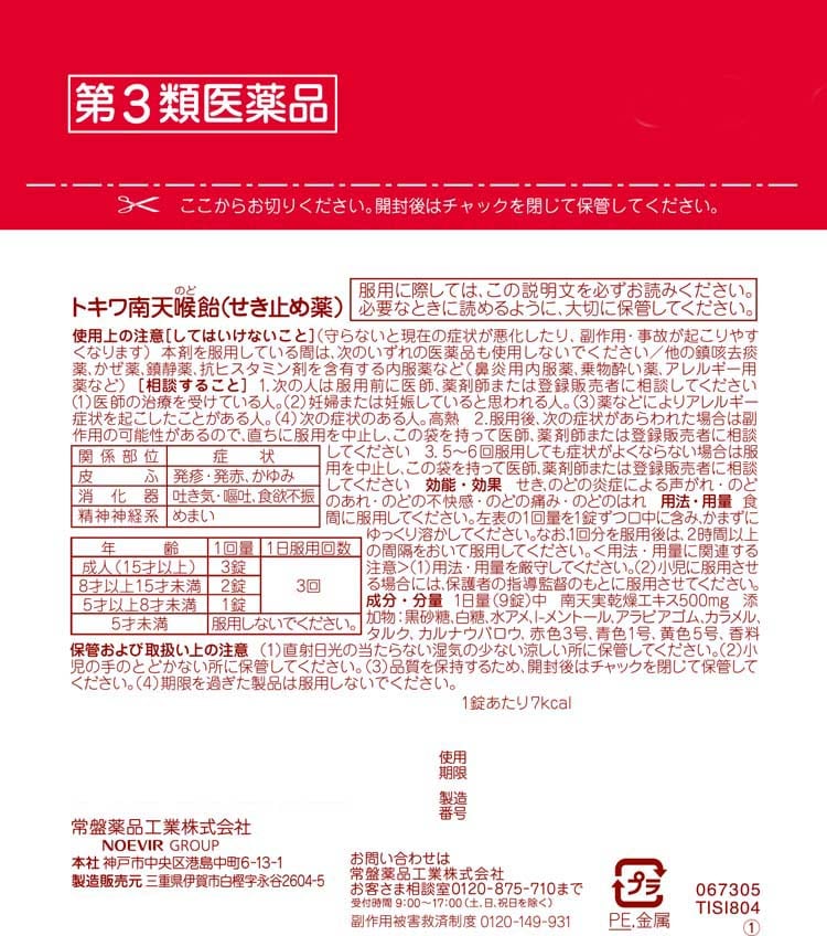 | (1日量(9錠)中) 南天実乾燥エキス:500mg 添加物:黒砂糖、白糖、水アメ、L-メントール、アラビアゴム、カラメル、タルク、カルナウバロウ、赤色3号、青色1号、黄色5号、香料 |