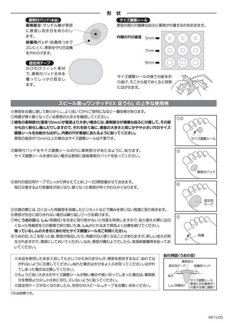 ●スピール膏TMワンタッチEXは、サリチル酸の角質軟化溶解作用を利用した角質剥離剤です。厚く硬くなった皮ふをやわらかくし、うおの目、たこ、いぼの角質を取り去ります。また、付属のサイズ調整シールにより、患部にのみ薬剤が付着するように調節できます。