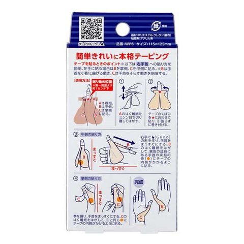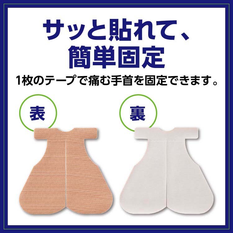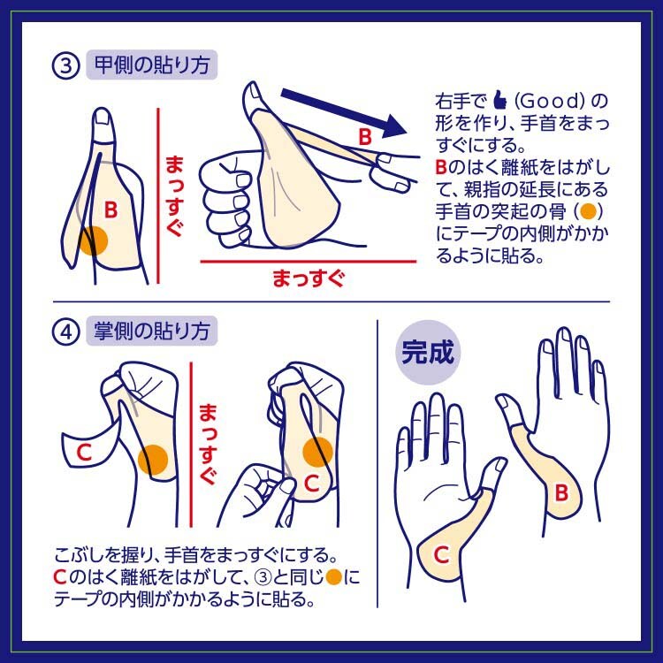 ・(3)甲側の貼り方:右手でGoodの形を作り、手首をまっすぐにする。Bのはく離紙をはがして、親指の延長にある手首の突起の骨にテープの内側がかかるように貼る。