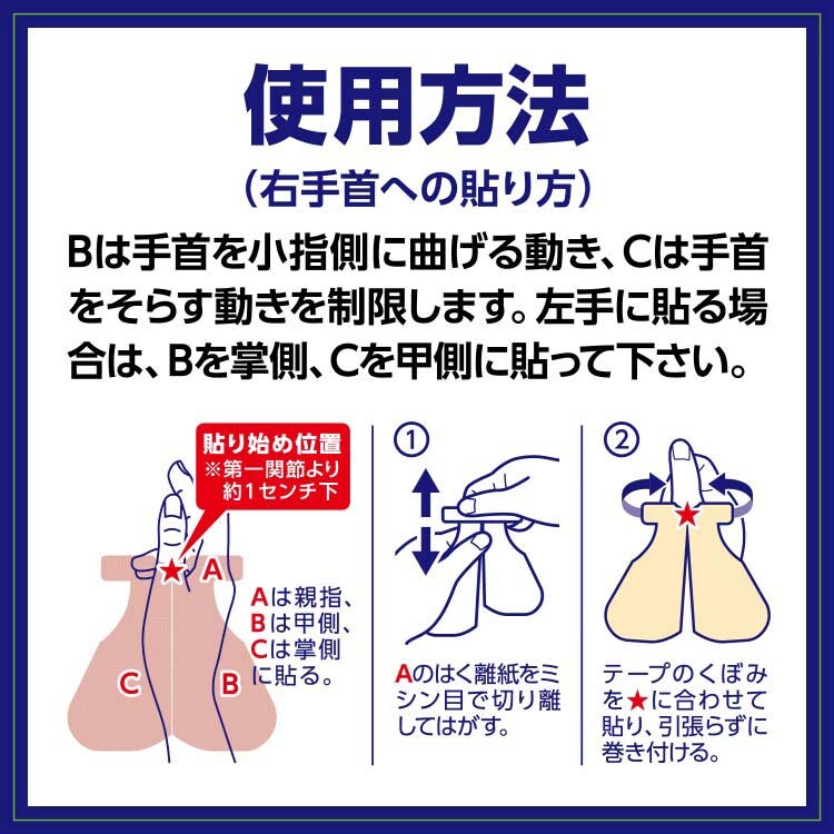 ・Aは親指、Bは甲側、Cは掌側に貼る。