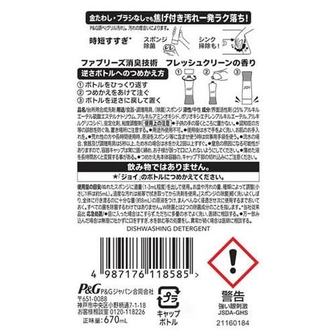 ジョイ W除菌 食器用洗剤 ファブリーズW消臭 フレッシュクリーン 詰め替え (670ml)