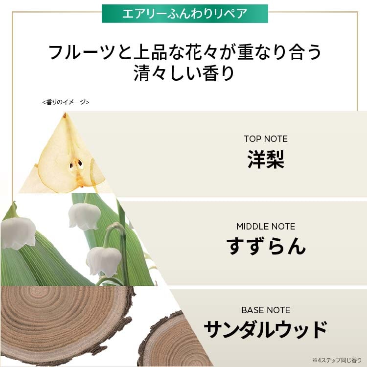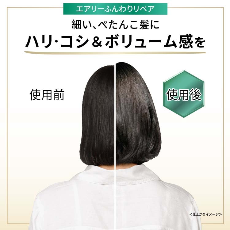 年齢を重ねると、髪が細くなりぺたんこに感じることもあるでしょう。エアリーふんわりリペアシリーズは、ハリ・コシを与え、自然なボリューム感のある髪へ導きます。