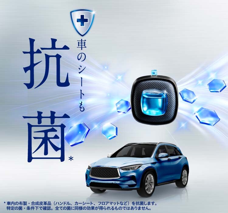 ●車内の布製・合成皮革製品(ハンドル、カーシート、フロアマットなど)を抗菌します。特定の菌・条件下で試験。全ての菌に同様の効果が得られるものではありません。