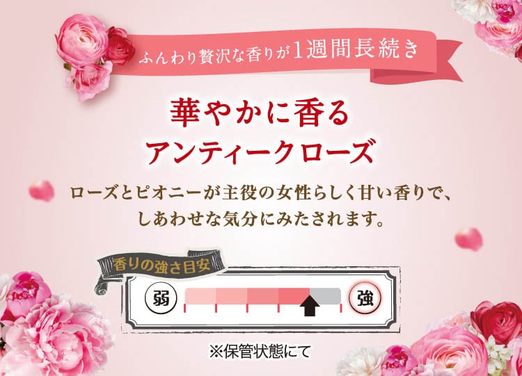 ●アンティークローズの香り:ローズとピオニーが主役の女性らしく甘い香り。