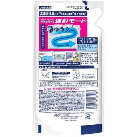 ★使用回数:約310回スプレーできます。(ボトルつめかえ時)。ファブリーズプレミアム速乾ジェットあらいたてのお洗濯の香りのボトルにつめかえてお使いください。洗剤などの他の製品などと混ぜないでください。