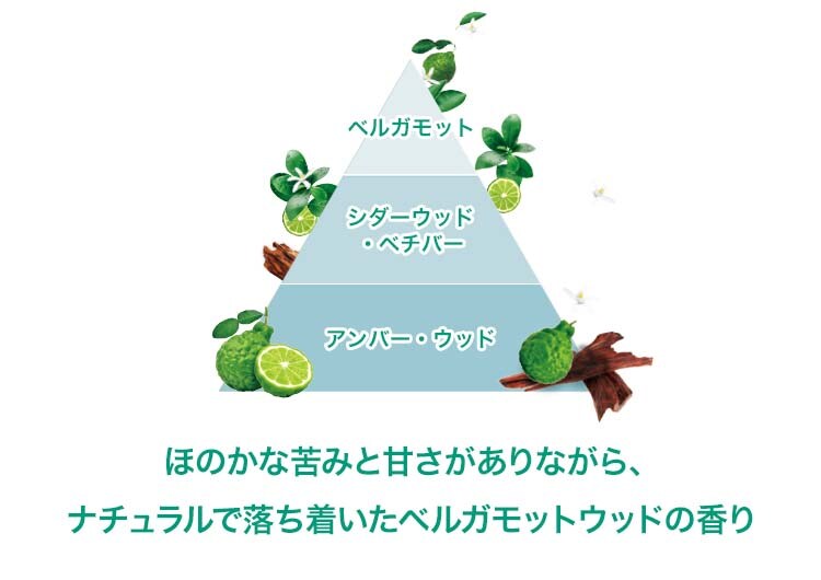 ●ベルガモットウッド:ほのかな苦みと甘さがありながら、ナチュラルで落ち着いたベルガモットウッドの香り。