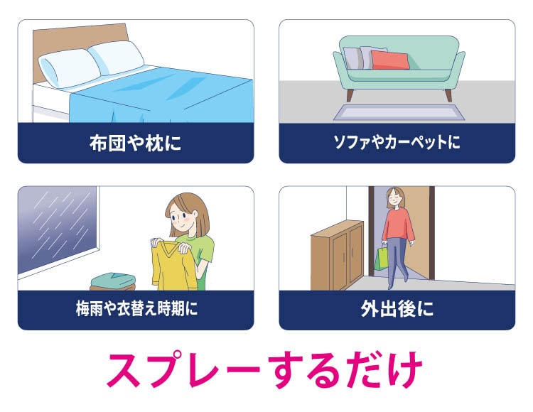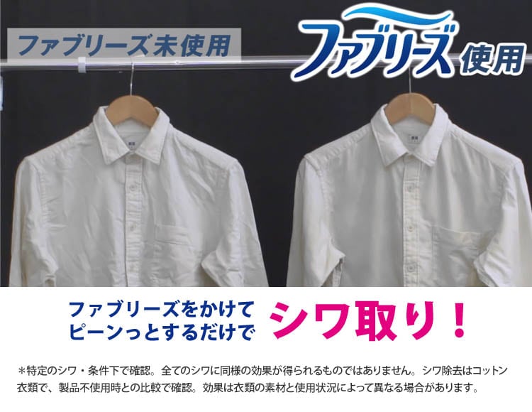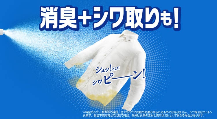 ・使用上の注意:革・和装品へは使用不可。毛、絹・レーヨン・アセテート・キュプラなど水に弱い繊維、水洗い不可の表示があるもの、防水・撥水加工など特殊加工されたものは、シミになったり、風合いを損ねる恐れがあるので、あらかじめ目立たない部分で試す。20cmより近づけたり、一度にスプレーしすぎたりしない。シミやベタつきの原因になることがある。汚れのあるものは、汚れが原因の輪ジミを起こすことがある。汚れが原因のニオイは、使用後、汚れから再びニオイが発生することがある。スプレーは手早く最後まで引ききる。床や家具など布製品以外についた場合はすぐに拭き取る。直射日光の当たる場所や温度差の激しい場所(電化製品の上など)での保管は避ける。狭い空間で使用するときは、換気して使用する。用途以外に使用しない。子供や認知症の方、ペットの届かないところにおき、誤飲等防ぐ。顔に向けてスプレーしない。目や皮膚に触れないようにする。小さくして捨てやすい、やわらかい素材を使用。開封前の破損や液もれに注意して取り扱う。窒息の原因になる可能性がありますので、容器キャップは常に固く締め、子供が誤って口に入れないようにする。万一、眼に入った場合は目を開けたまま水で15-20分優しく洗う。コンタクトレンズ着用時は5分洗ってから外し、引き続き目を洗う。皮膚についた場合はよく水で洗い流す。飲み物ではありません。誤って口に入った場合は、水を飲み、すぐに医師に相談する。