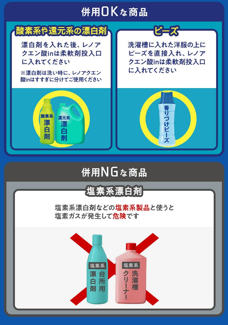 ・さらに柔らかさや香りを足したい時は、まず本品を適正量入れた後に、投入口からあふれない量のレノア柔軟剤を足してください。