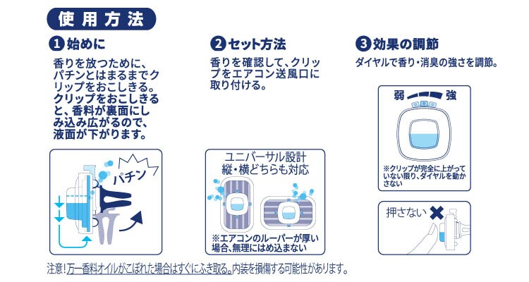 (2) セット方法 香りを確認して、クリップをエアコン送風口に取り付ける。ユニバーサル設計 縦・横どちらも対応。エアコンのルーバーが厚い場合、無理にはめ込まない。押さない。