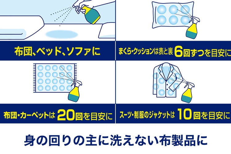 ・しっかり除菌・消臭するために、まくら、クッションは表と裏6回、布団・カーペットは20回、スーツ・制服のジャケットは10回ずつを目安に表面を隙間なくスプレーする。