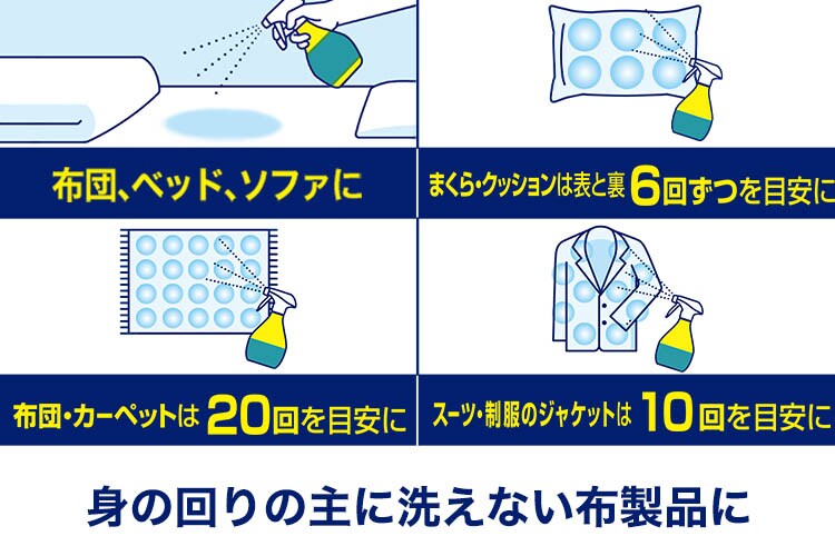 ●布団・マットレス・枕・ソファなど 寝汗や加齢臭に肌に触れる衣類やお子さまのいる家庭での使用もOK!