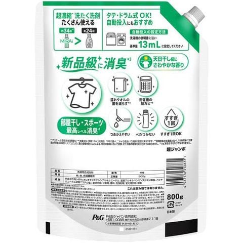 アリエール 洗濯洗剤 MiRAi 超濃縮コンパクト洗剤 部屋干し&スポーツ 詰め替え (800g)