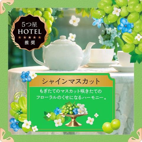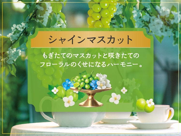 ●シャインマスカット:もぎたてのマスカットと咲きたてのフローラルのクセになるハーモニー。