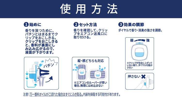 (2) セット方法 香りを確認して、クリップをエアコン送風口に取り付ける。