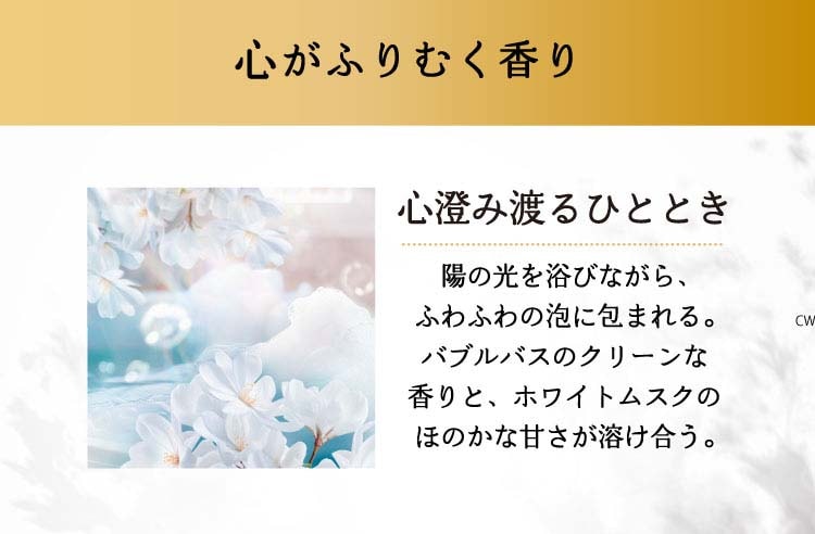 ●バブルバスのクリーンな香りと、ホワイトムスクのほのかな甘さが溶け合う。