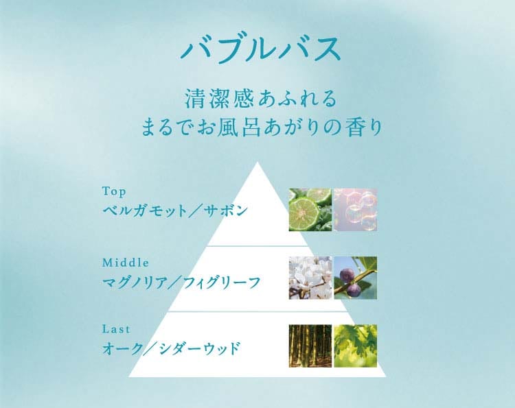 ●バブルバスのクリーンな香りと、ホワイトムスクのほのかな甘さが溶け合う。