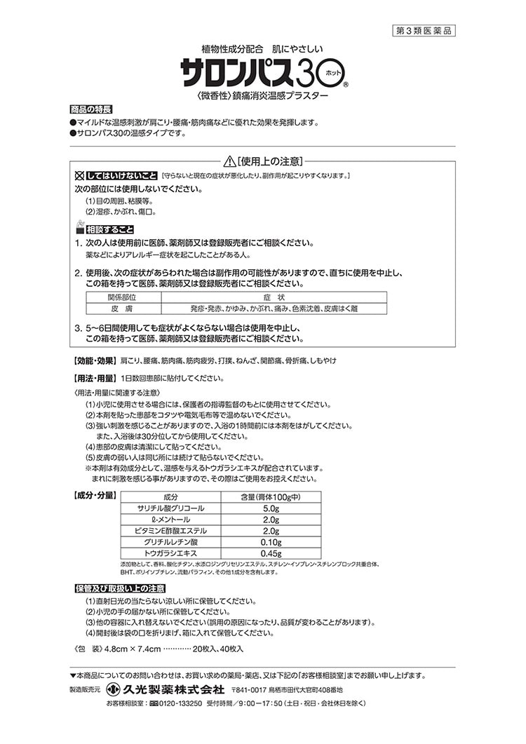 製造販売元 久光製薬株式会社 〒841-0017 鳥栖市田代大宮町408番地 お客様相談室 0120-133250 受付時間 9:00-17:50(土日・祝日・会社休日は除く)