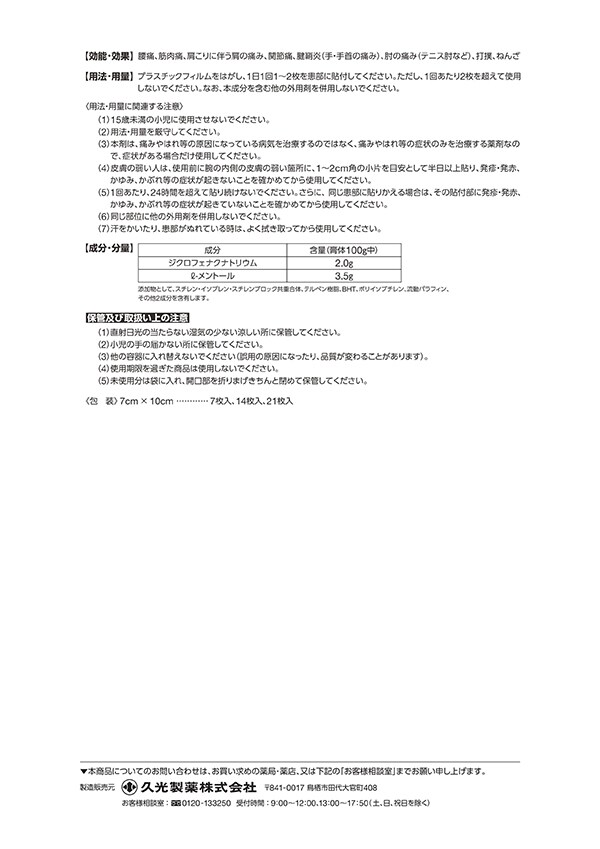 ・プラスチックフィルムをはがし、1日1回1~2枚を患部に貼付してください。ただし、1回あたり2枚を超えて使用しないでください。なお、本成分を含む他の外用剤を併用しないでください。