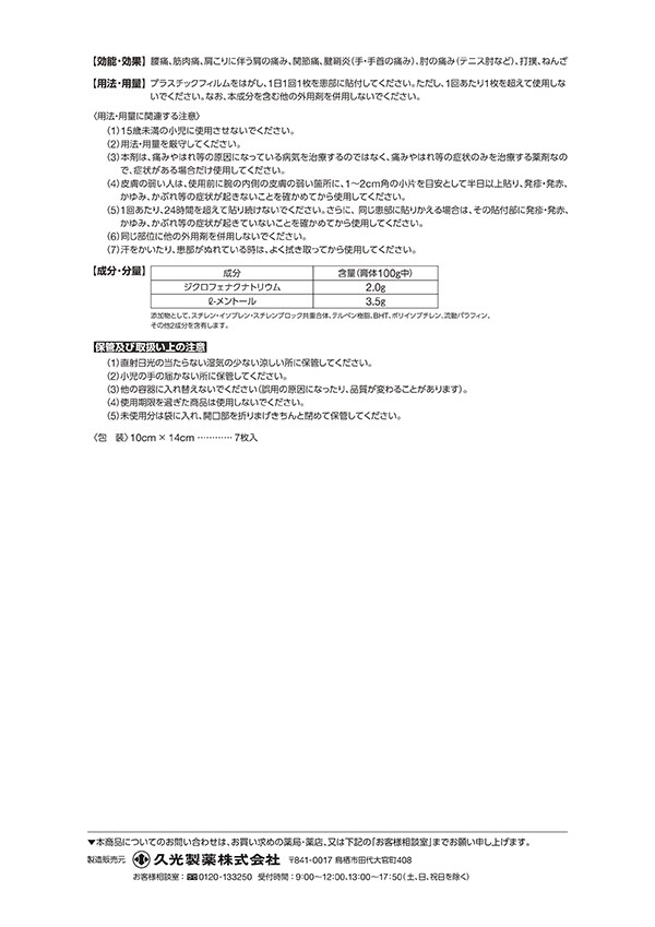 ・プラスチックフィルムをはがし、1日1回1枚を患部に貼付してください。ただし、1回あたり1枚を超えて使用しないでください。なお、本成分を含む他の外用剤を併用しないでください。