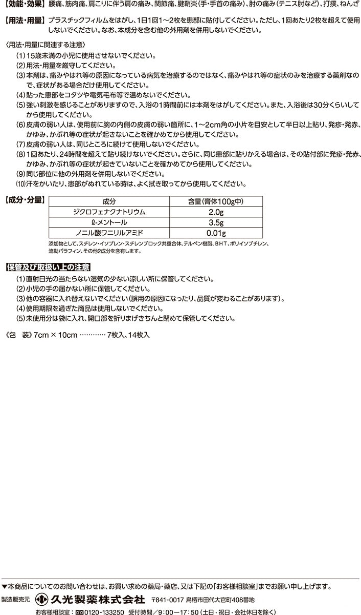 | (膏体100g中) ジクロフェナクナトリウム・・・2.0g L-メントール・・・3.5g ノニル酸ワニリルアミド・・・0.01g 添加物として、スチレン・イソプレン・スチレンブロック共重合体、テルペン樹脂、BHT、ポリイソブチレン、流動パラフィン、その他2成分を含有します。 |