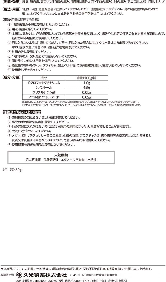 | 100g中 ジクロフェナクナトリウム:1.0g l-メントール:4.5g グリチルレチン酸:0.05g ノニル酸ワニリルアミド:0.02g 添加物として、エタノール、ジエタノールアミン、疎水化ヒドロキシプロピルメチルセルロース、トウガラシチンキ、BHT、ヒドロキシプロピルセルロース、プロピレングリコール、ポリオキシエシレンベヘニルエーテル、その他3成分を含有します。 |