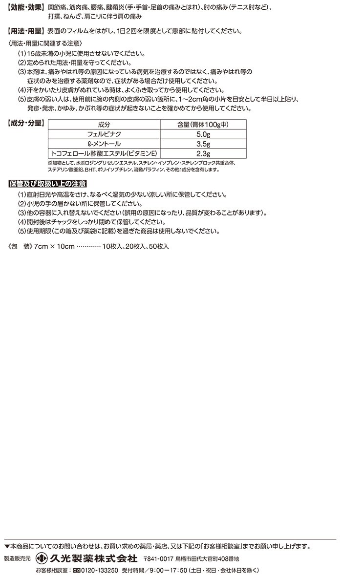 ●効きめ成分フェルビナクを5.0%配合した、経皮鎮痛消炎テープ剤。