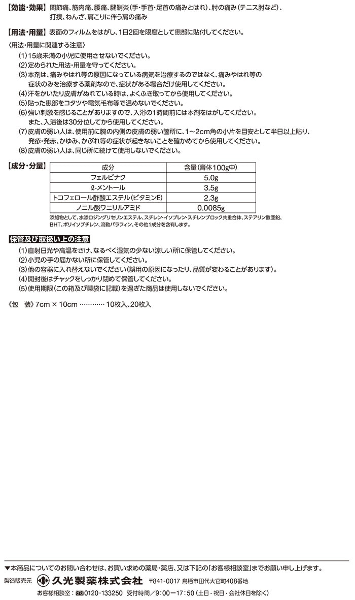 | [成分:含量(膏体100g中)] フェルビナク:5.0g l-メントール:3.5g トコフェロール酢酸エステル(ビタミンE):2.3g ノニル酸ワニリルアミド:0.0085g 添加物として、水添ロジングリセリンエステル、スチレン・イソプレン・スチレンブロック共重合体、ステアリン酸亜鉛、BHT、ポリイソブチレン、流動パラフィン、その他1成分を含有します。 |