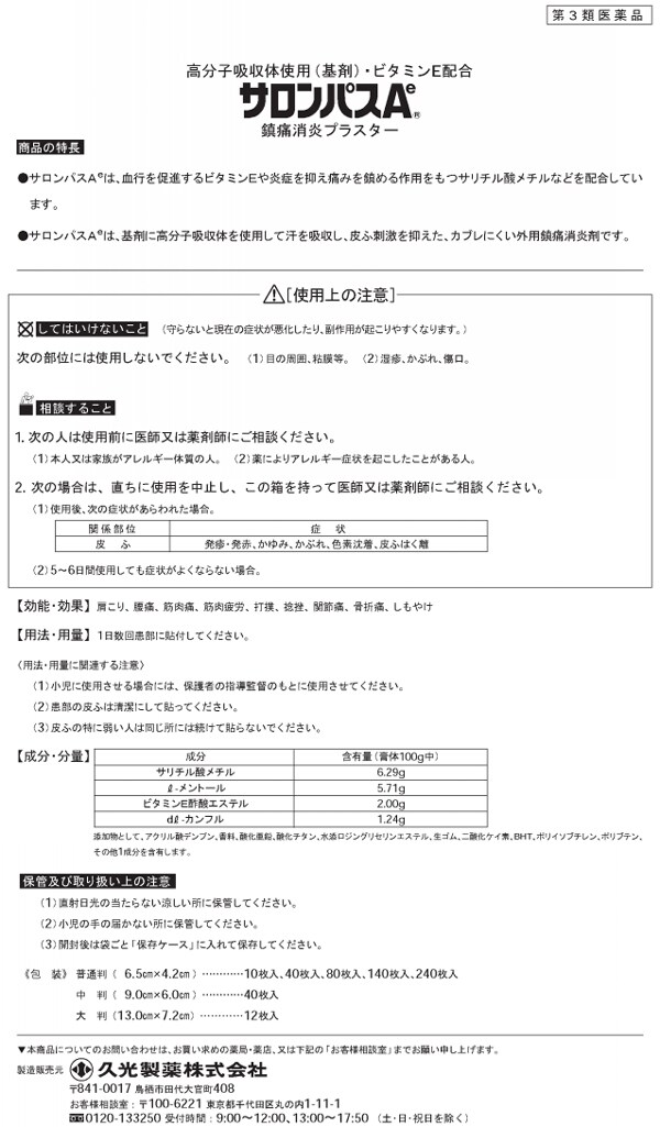 ●サロンパスAEは、基剤に高分子吸収体を使用して汗を吸収し、皮膚刺激を抑えた、カブレにくい外用消炎鎮痛剤です。