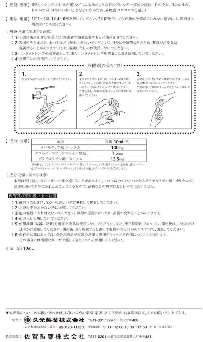| (10mL中) クロモグリク酸ナトリウム:100mg クロルフェニラミンマレイン酸塩:1.5mg グリチルリチン酸二カリウム:12.5mg 添加物:イプシロン-アミノカプロン酸、エタノール、エデト酸ナトリウム水和物、d-カンフル、d-ボルネオール、プロピルパラベン、ホウ砂、ホウ酸、メチルパラベン ※本剤は点眼後、ときに口中に甘味を感じることがあります。これは成分のひとつであるグリチルリチン酸二カリウムが、涙道を通って口中に流れ出ることによるもので、品質などの異常によるものではありません。 |