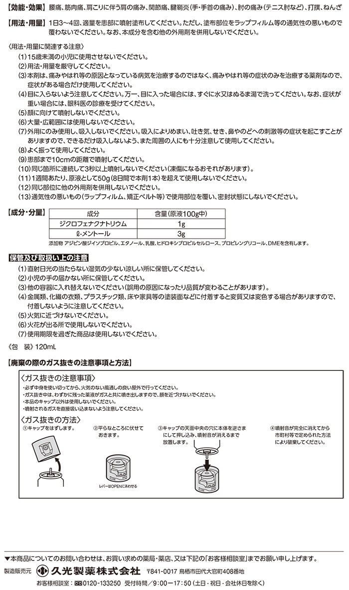 ●優れた抗炎症、鎮痛効果が認められている成分「ジクロフェナクナトリウム」1.0%と血流をよくする成分「Lメントール」3.0%を配合した鎮痛消炎スプレー剤です。