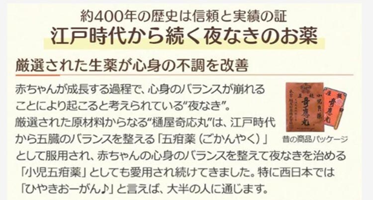●樋屋奇応丸 銀粒は4種類の厳選された生薬からなり、穏やかに作用してお子さまの夜なき・食欲不振などに効果をあらわします。