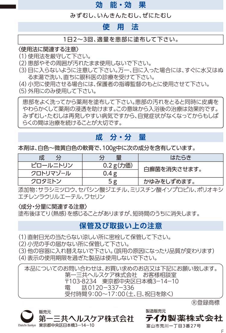 | ・本剤は、白色~微黄白色の軟膏で、100g中に次の成分を含有しています。 ピロールニトリン:0.2g(力価) クロトリマゾール:0.4g クロタミトン:5g 添加物:サラシミツロウ、セパシン酸ジエチル、ミリスチン酸イソプロピル、ポリオキシエチレンラウリルエーテル、ワセリン ★成分・分量に関連する注意 塗布後ほてり(熱感)を感じることがありますが、短時間のうちに消失します。 |