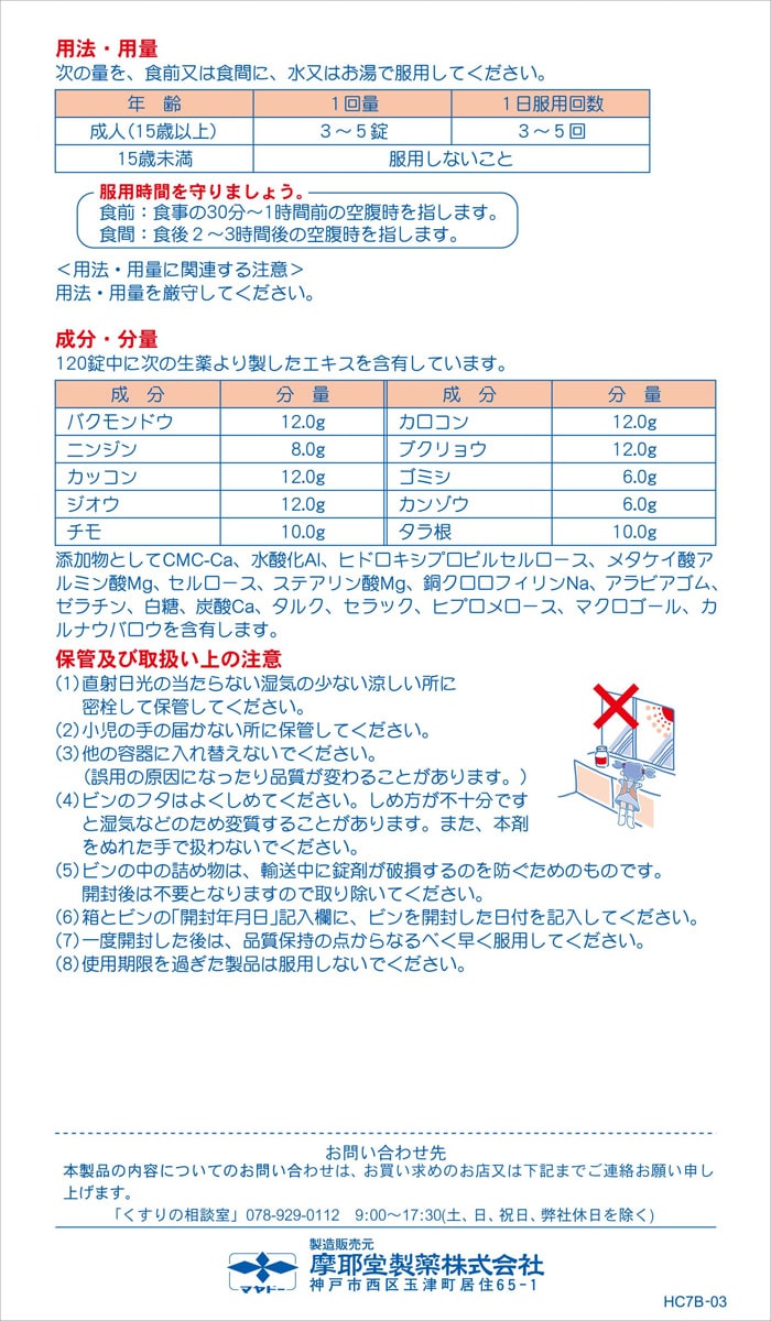 | 120錠中に次の生薬より製したエキスを含有しています。 [成分:分量] バクモンドウ:12.0g ニンジン:8.0g カッコン:12.0g ジオウ:12.0g チモ:10.0g カロコン:12.0g ブクリョウ:12.0g ゴミシ:6.0g カンゾウ:6.0g タラ根:10.0g 添加物としてCMC-Ca、水酸化Al、ヒドロキシプロピルセルロース、メタケイ酸アルミン酸Mg、セルロース、ステアリン酸Mg、銅クロロフィリンNa、アラビアゴム、ゼラチン、白糖、炭酸Ca、タルク、セラック、ヒプロメロース、マクロゴール、カルナウバロウを含有します。 |