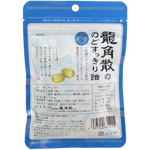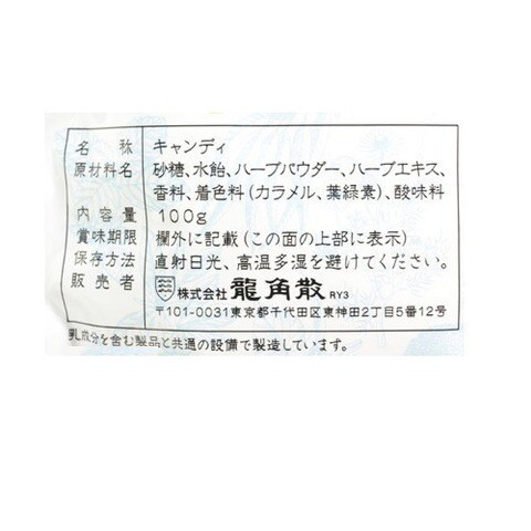 | ・原材料名:砂糖、水飴、ハーブパウダー、ハーブエキス、香料、着色料(カラメル、葉緑素)、酸味料 ・栄養成分表示:100gあたり エネルギー:389kcaL、たんぱく質:0g、脂質:0g、炭水化物:97g、ナトリウム:0mg |